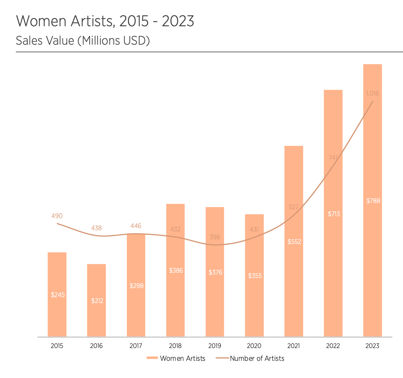 Auction sales by women artists generated $787.9M in sales in 2023, up 10.5% from 2022.