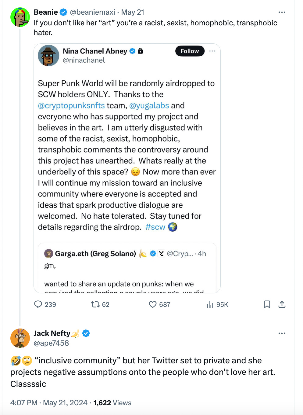 🍎 Yuga Labs’s Punk in Residence program featuring Nina Chanel Abney's “Super Punk World” collection, that intended to merge art, technology, and culture by reinterpreting CryptoPunk traits faced major backlash this week. The community criticized Nina’s work as excessively woke and misaligned with the established CryptoPunks brand, expressing concerns over the dilution of the original collection by Yuga Labs.