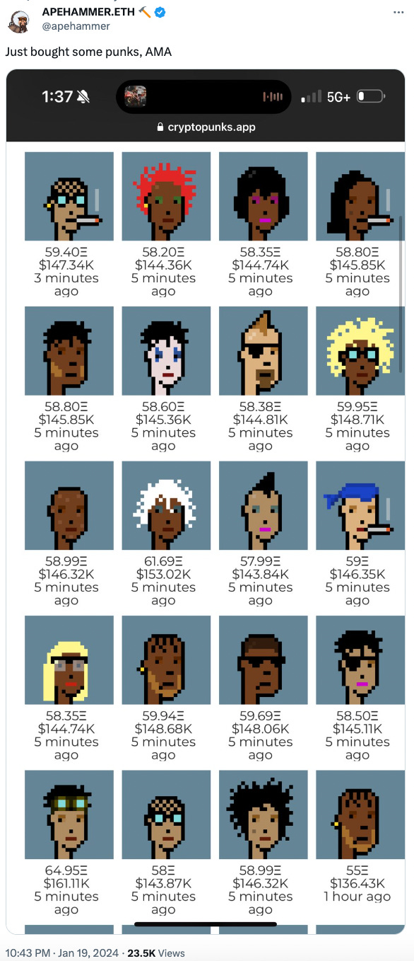 There were two big CryptoPunk sales this week, both on the 16th of January. Additionally, an offer for CryptoPunk 7804 (image below) at 1.7K ETH / $4.19M which was later withdrawn. Fun fact, Punk 7804 was bought on March 11th, 2021 for 4.2 ETH / $7.57M and got a respectful offer last November 2nd, 2023 for 7.8K ETH / $14.25M, seems like the hodler is in for some more - so this week’s offer is considered peanuts 🥜.